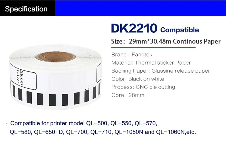 Brother Tape DK-22210 Continuous Label Cartridge | Baleyo.com Brother Tape DK-22210 Continuous Label Cartridge. Rs ... DK-22210: Function For The Model (QL-570 / QL-700 / QL-760 ) Flexibility to create labels to size: Paper Type: DK: Paper Width (min~max) 29 mm: Paper Length: 30m: Remarks: Durable White Paper Tape - Wide - Black Print on White: Brand: