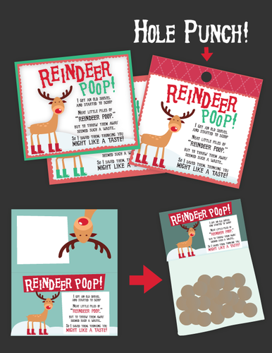 Silly Stocking Fillers! Reindeer Poop - Free Printable Labels Reindeer Poop Print the Reindeer Poop labels onto thick white paper or thin white card. Cut out and fold in half. Fill a 6"/15cm wide cellophane food bag with the Maltesers/Whoppers/Chocolate Malt Balls. Fold the open end of the bag over to "seal" it, then place the folded label on top. Staple into ...